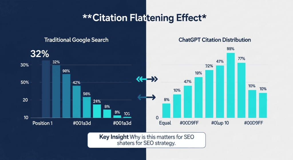 Traditional search heavily favors position one (roughly 32% of clicks go to the top result). ChatGPT, however, distributes citations more evenly across Google’s top 10 results, meaning you don’t need position one to be cited in AI responses.