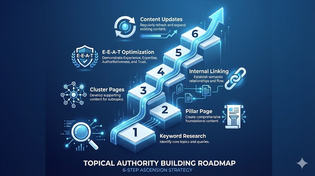 Building topical authority requires strategic planning, consistent content creation, and ongoing optimization. Start by conducting thorough keyword research, building a pillar page that broadly covers your main topic, and creating cluster pages that explore specific subtopics in depth. Connect these pages through strategic internal linking, demonstrate E-E-A-T signals, and commit to regular updates and expansion.