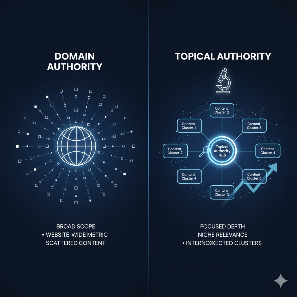 This distinction is critical for 2025 SEO strategy. While domain authority still influences overall rankings, topical authority increasingly determines visibility for niche searches, featured snippets, and AI-generated search overviews.