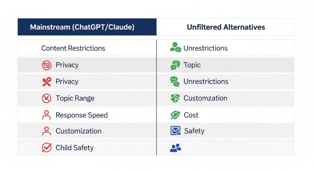 | Feature | Mainstream (ChatGPT/Claude) | Unfiltered Alternatives |