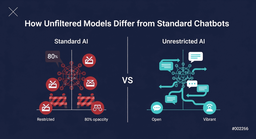 The distinction is crucial: mainstream chatbots like ChatGPT and Claude use Reinforcement Learning from Human Feedback (RLHF) and alignment training to avoid sensitive topics. Unfiltered alternatives remove these layers, allowing the underlying language model to generate responses based purely on the prompt and training data.